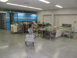 約200万冊の資料が配架されています。一部は電動式の集密書架になっています。 資料は各カウンターからファックスで請求され、搬送機で各階へ運ばれます。