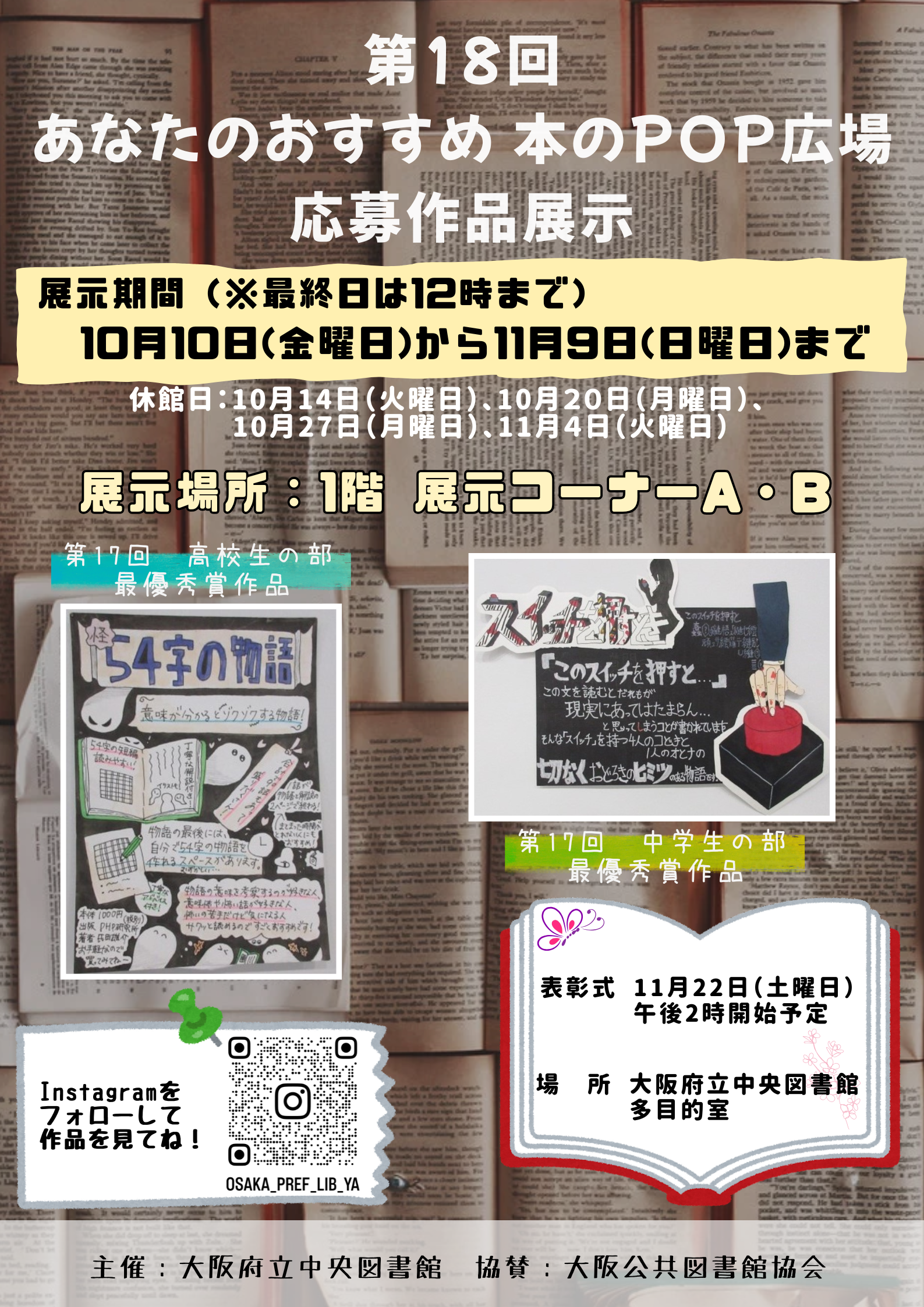 第18回目を迎える今回は、中学生の部917点、高校生の部801点ものご応募をいただきました。本の魅力を短い言葉や、イラストで伝えるPOP作品。POP作品を見ていただき、「読みたい」と思った本を借りて帰ってください。また、来館者の皆様が「読んでみたい」と思う作品に投票する「来館者投票」を10月10日(金曜日)から10月26日(日曜日)の期間で投票受付予定です。投票結果は、大阪府立中央図書館YAインスタグラム等にて後日お知らせいたします。