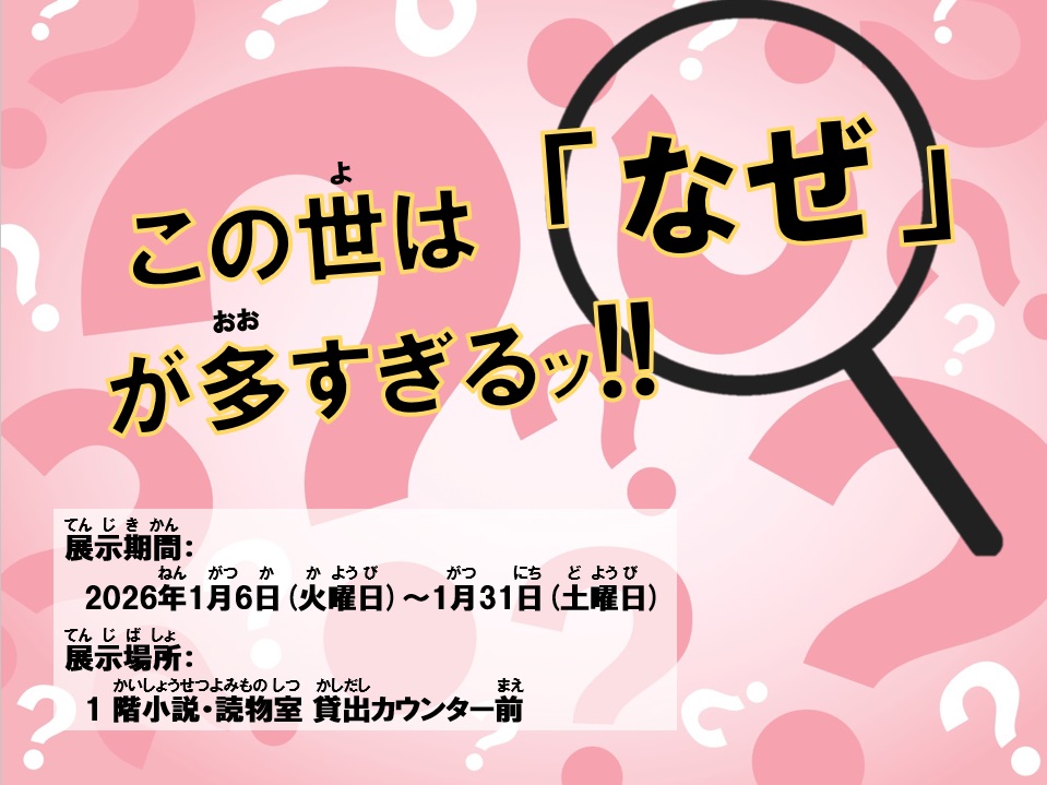 今回の展示では、『バナナの皮はなぜすべるのか?』など、様々な分野の「なぜ」と思うことが書かれた本を集めました。