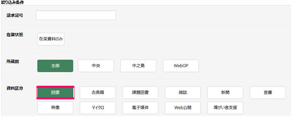(3)絞り込み条件の「図書」をクリックする(1-1-1.全項目検索の(3)参照)