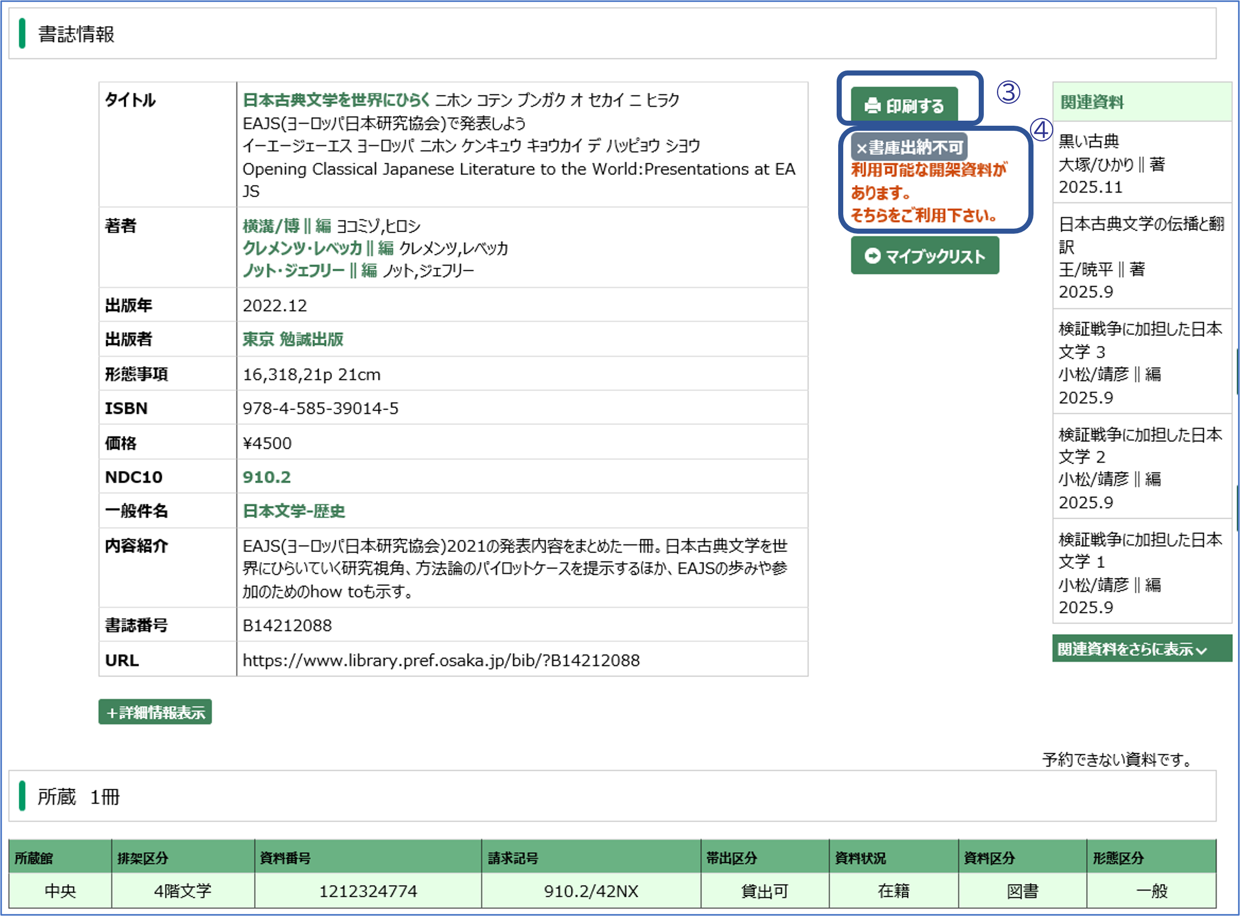 この本が、どちらの府立図書館(中央・中之島)にあるかを示しています。