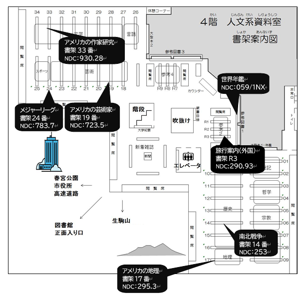 ※ アメリカの文学作品(NDCの933)は1階小説読物室に配架されています。