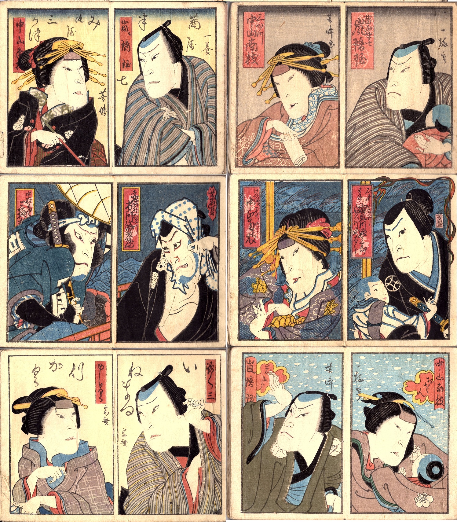 文政3年(1820)9月の北堀江の芝居「時再興在原景図」と角座「八陣守護城」に取材したもの。同時期に別劇場で行われた芝居を大首の1枚にまとめている。