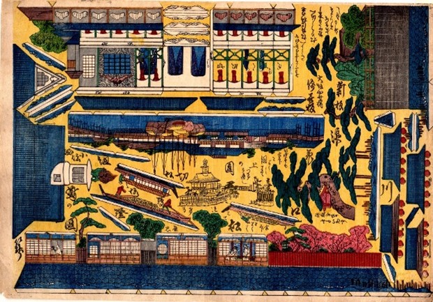 「立版古」は、一枚摺りの錦絵であり、風景や建築、芝居の様子などを一枚の和紙に摺り込み、パーツを切り抜いて立体的に組み立てるようにしたもの